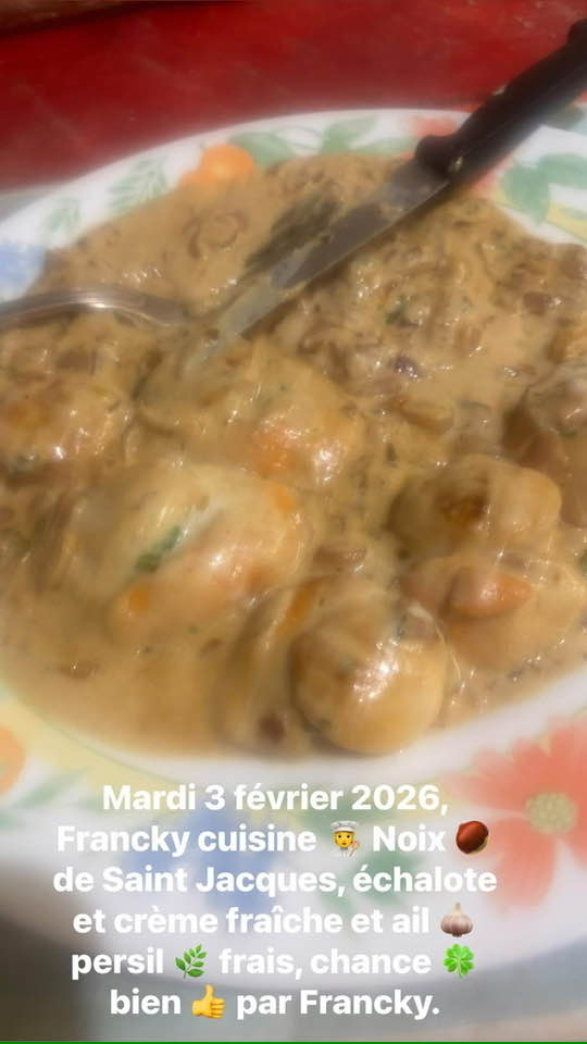 Mardi 3 février 2026, on épluche et coupe les échalotes, ensuite ,on les fait revenir au beurre, ensuite on fait dorer les noix de Saint Jacques de chaque côté à feu doux, on rajoute ail et persil frais , on ajoute les échalotes et la crème fraîche et on remue souvent, Bon Appétit.