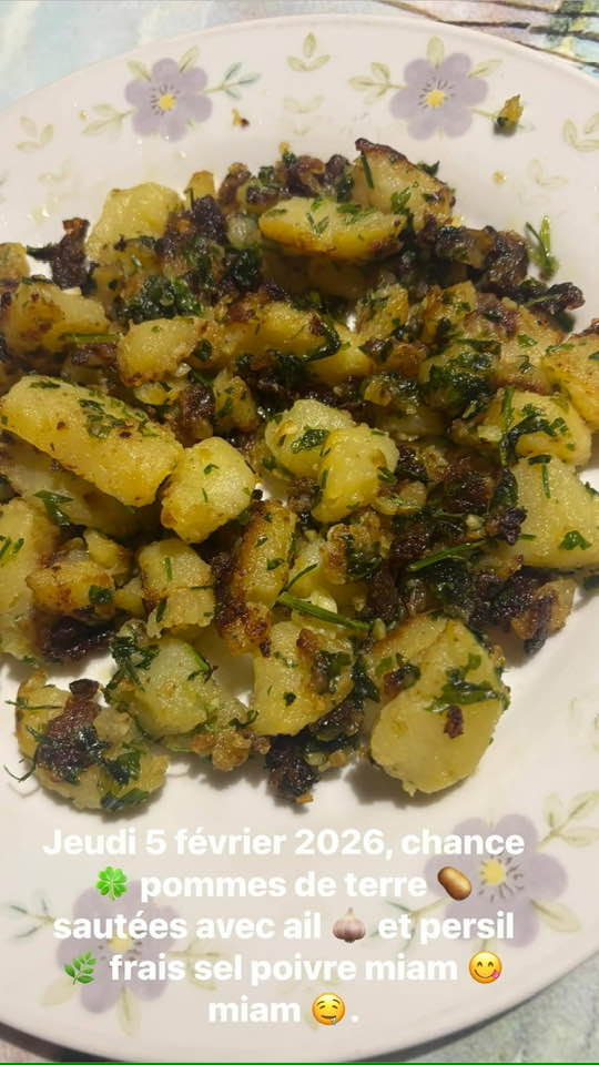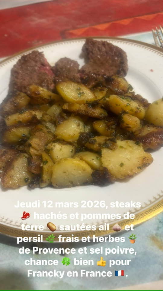 Jeudi 12 mars 2026, on prends une petite poêle et on fait revenir au beurre le steak hâché sel poivre, ensuite on fait bouillir des pommes de terre épluchées , coupées, ensuite on les passe à un filet huile arachide on les fait dorer de chaque côté ensuite on les passe au beurre, ail et persil frais , et herbes de Provence Bon Appétit!
