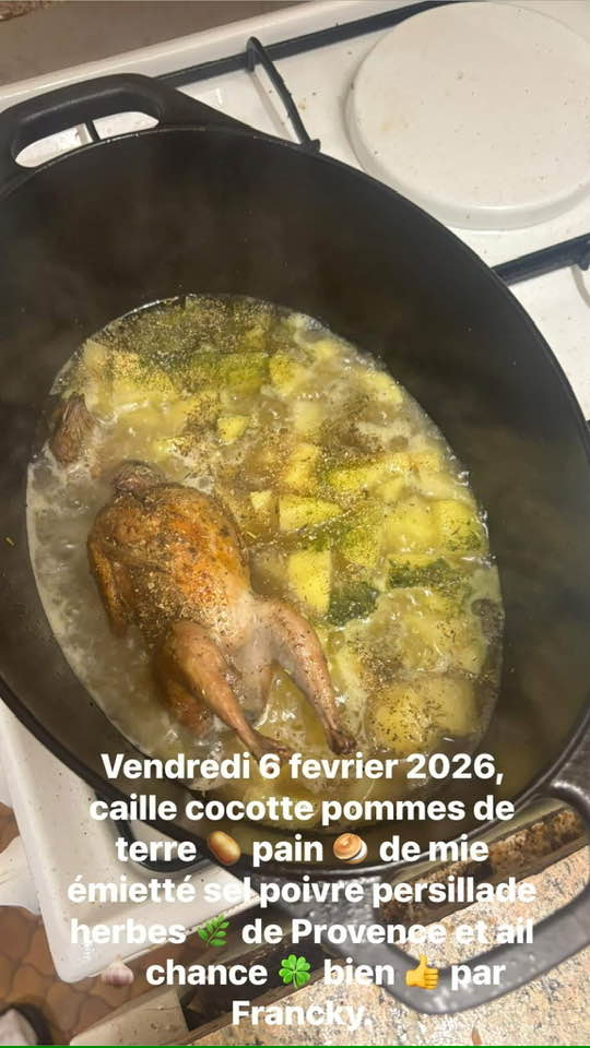 Vendredi 6 février 2026, on épluche et coupez les patates, on mets la caille à feux doux pendant 25 minutes et on retourne la caille toute les 4 minutes, ensuite on mets les patates, ensuite, ail , persillade, et herbes de Provence, 5 minutes avant la fin de cuisson , on émiette du pain de mie dans la cocotte, et on remue souvent, Bon Appétit!