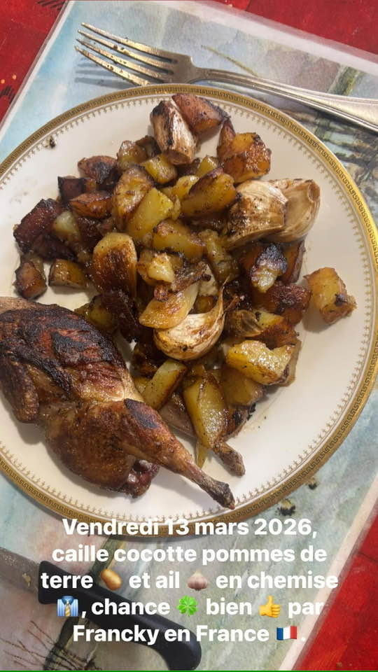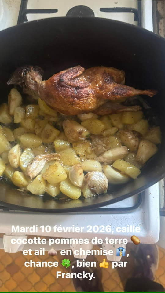 Vendredi 13 mars 2026, il y a 25 minutes de cuisson à feu doux pour la caille et on la retourne toute les 5 minutes, ensuite on retire la caille de la cocotte , et on a épluchées et coupées en petit morceaux, les patates, et on mets aussi ail en chemise, on rajoute un peu eau toutes les 5 minutes de cuisson, on remue souvent sur 20 minutes de cuisson à feu doux, Bon Appétit!