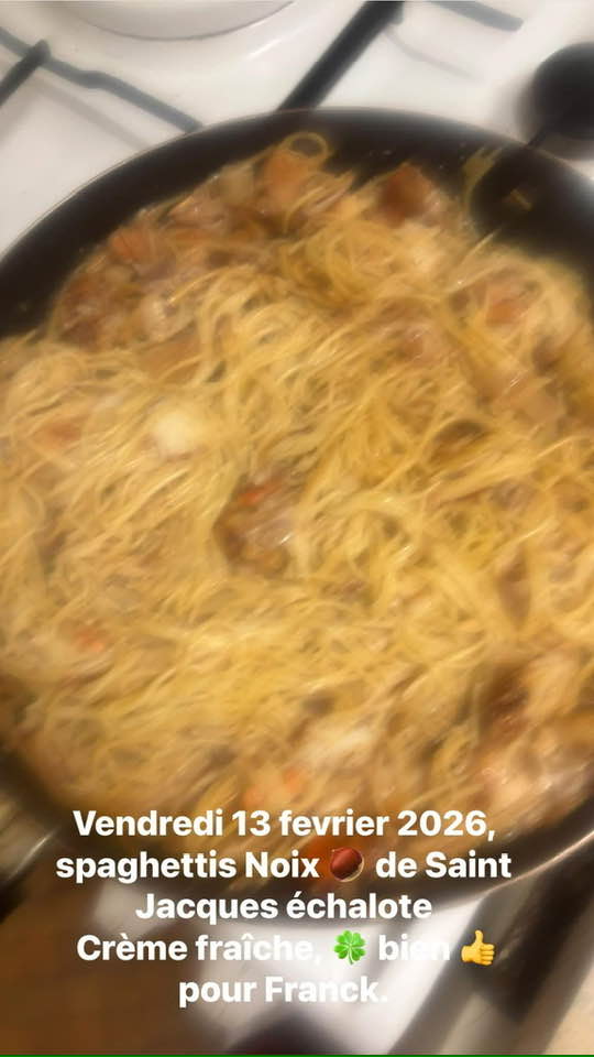 Vendredi soir 13 février 2026,éplucher et couper échalote, les faire revenir au beurre à feu doux, ensuite prendre les Noix de Saint Jacques et les faire dorer de chaque côté à feu doux ,il faut qu'elles soient saisies mais pas cramé, mettre les spaguettis à cuire, quand c'est prêt tout mélanger dans la poêle, rajouter ail , persillade et herbes de Provence, remuez souvent, Bon Appétit!