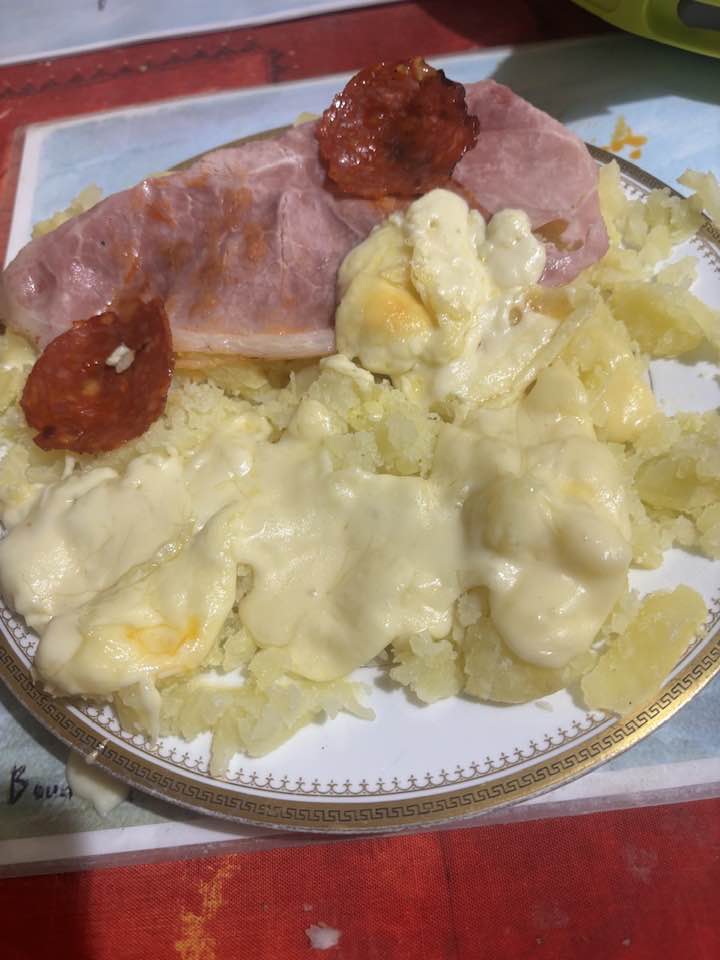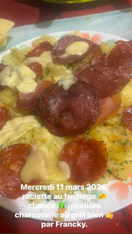 Mercredi 11 mars 2026, on épluche et coupe pommes de terre, on mets à bouillir, quand c'est cuit , on les écrase avec une fourchette dans une assiette, on rajoute sel ,poivre, ail et persil frais et herbes de Provence, ensuite on verse le fromage chaud dessus, au grill on fait chauffer de fines tranches de chorizo et rosette et jambon sec du pays, Bon Appétit!