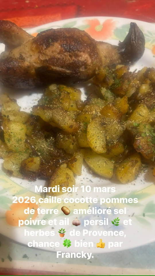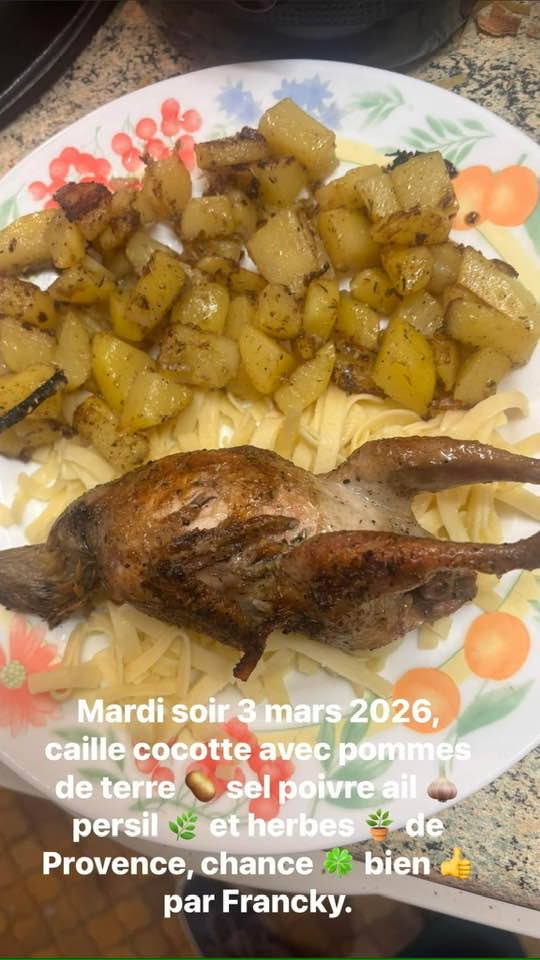 Mardi 3 mars 2026, on fait cuire la caille 20 minutes , en la retournant toute les 4 minutes, ensuite, on épluche et coupe des patates ,on rajoute un peu eau dans huile chaude, on rajoute sel, poivre,ail et persil frais, herbes de Provence et ciboulette, Bon Appétit!