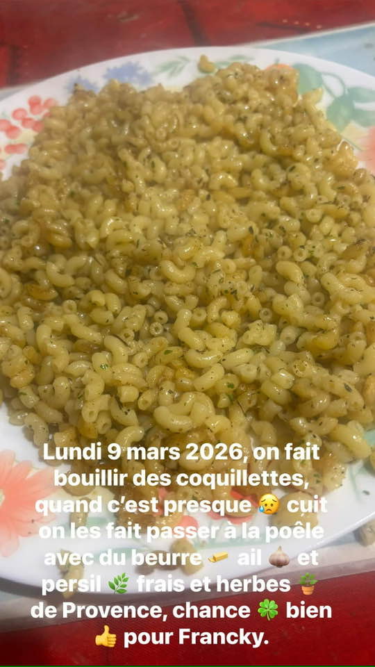 Lundi 9 mars 2026, on fait bouillir des coquillettes quand c'est presque cuit , on les passe à la poêle, avec du beurre et on rajoute ail et persil frais et herbes de Provence, Bon Appétit.