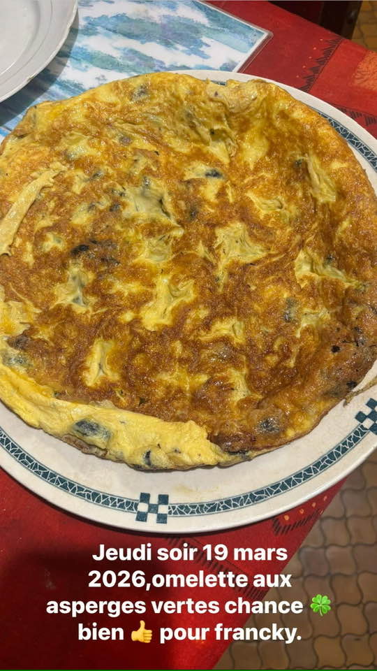 Jeudi soir 19 mars 2026, on nettoie les asperges vertes et on les coupent en petits morceaux, de huile et du beurre dans une poêle, on prépare les oeufs battus ,sel ,poivre,on verse les oeufs et on fait cuire des 2 côtés en retournant Bon Appétit!